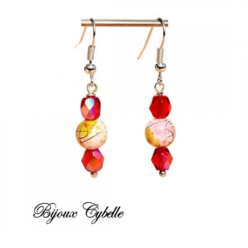 Boucles d’oreilles en verre rouge et beige.
